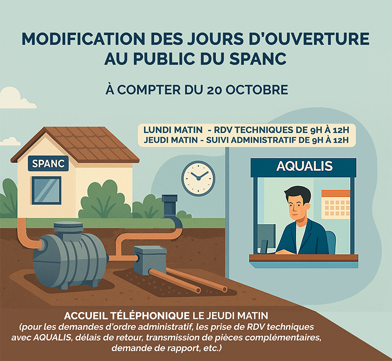 À compter du lundi 20 octobre, l’organisation de l’accueil du SPANC (Service Public d’Assainissement Non Collectif) évolue afin d’améliorer la qualité du service rendu au public et d’adapter les plages d’ouverture aux besoins des usagers.