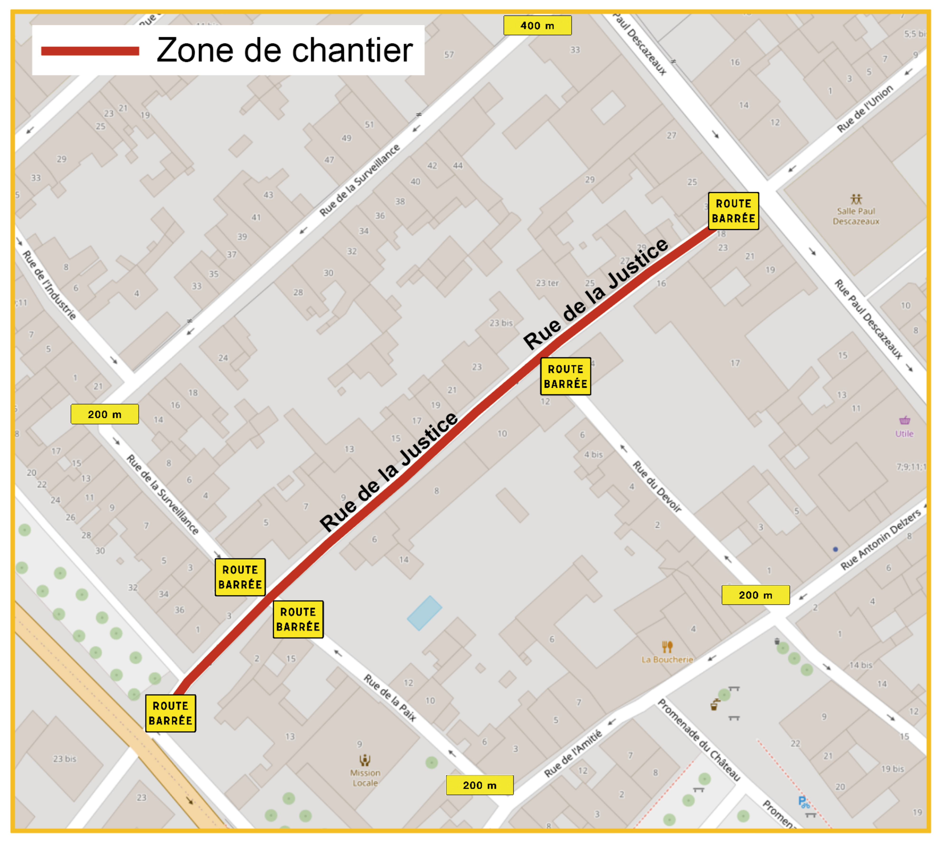 La rue de la Justice sera barrée au niveau de la rue Paul Descazeaux (sens unique) et côté boulevard, et interdite à la circulation et au stationnement.