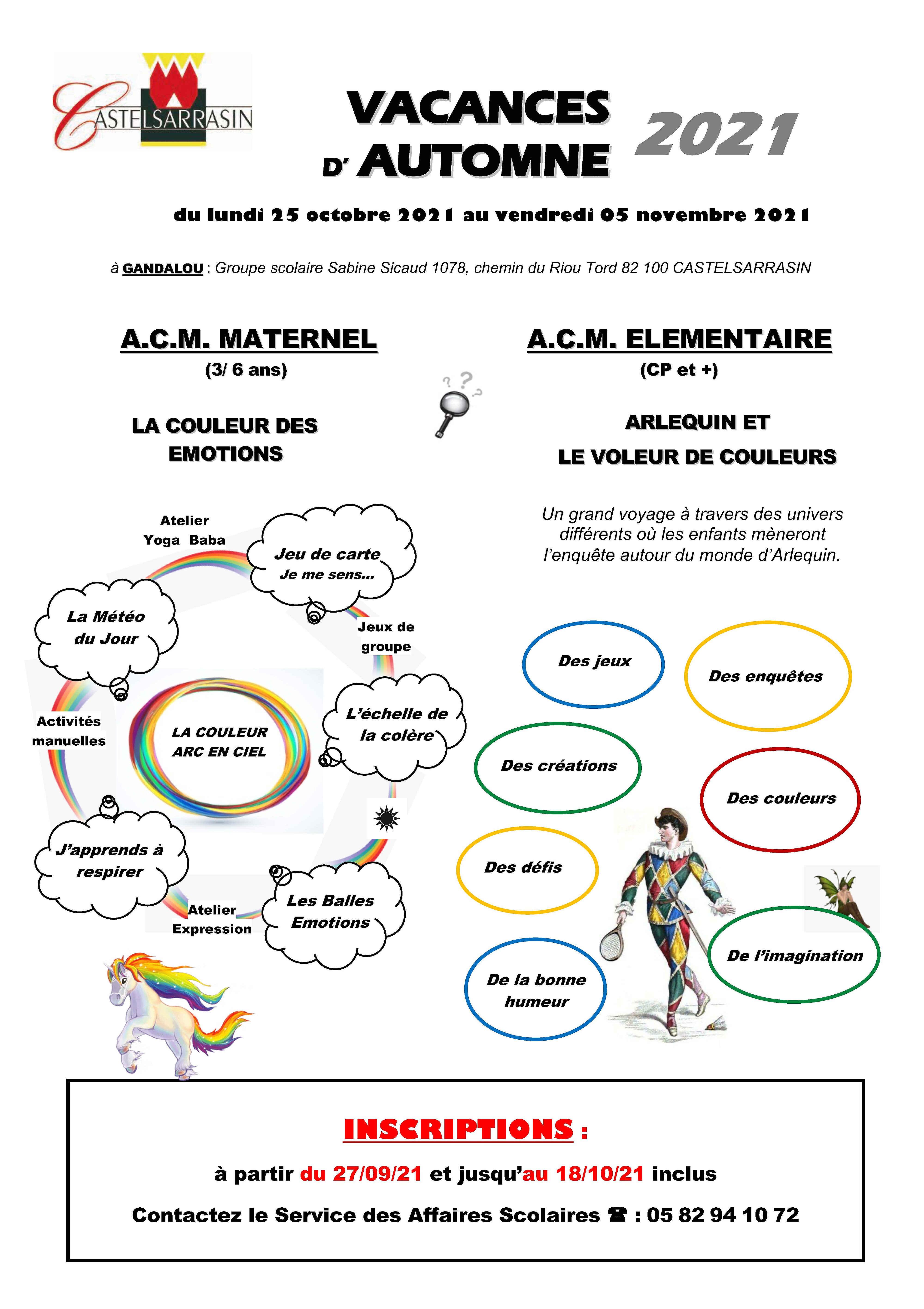 L'accueil de loisirs accueillera les enfants de la petite section de maternelle au CM2 : Du lundi 25 octobre au vendredi 5 novembre 2021