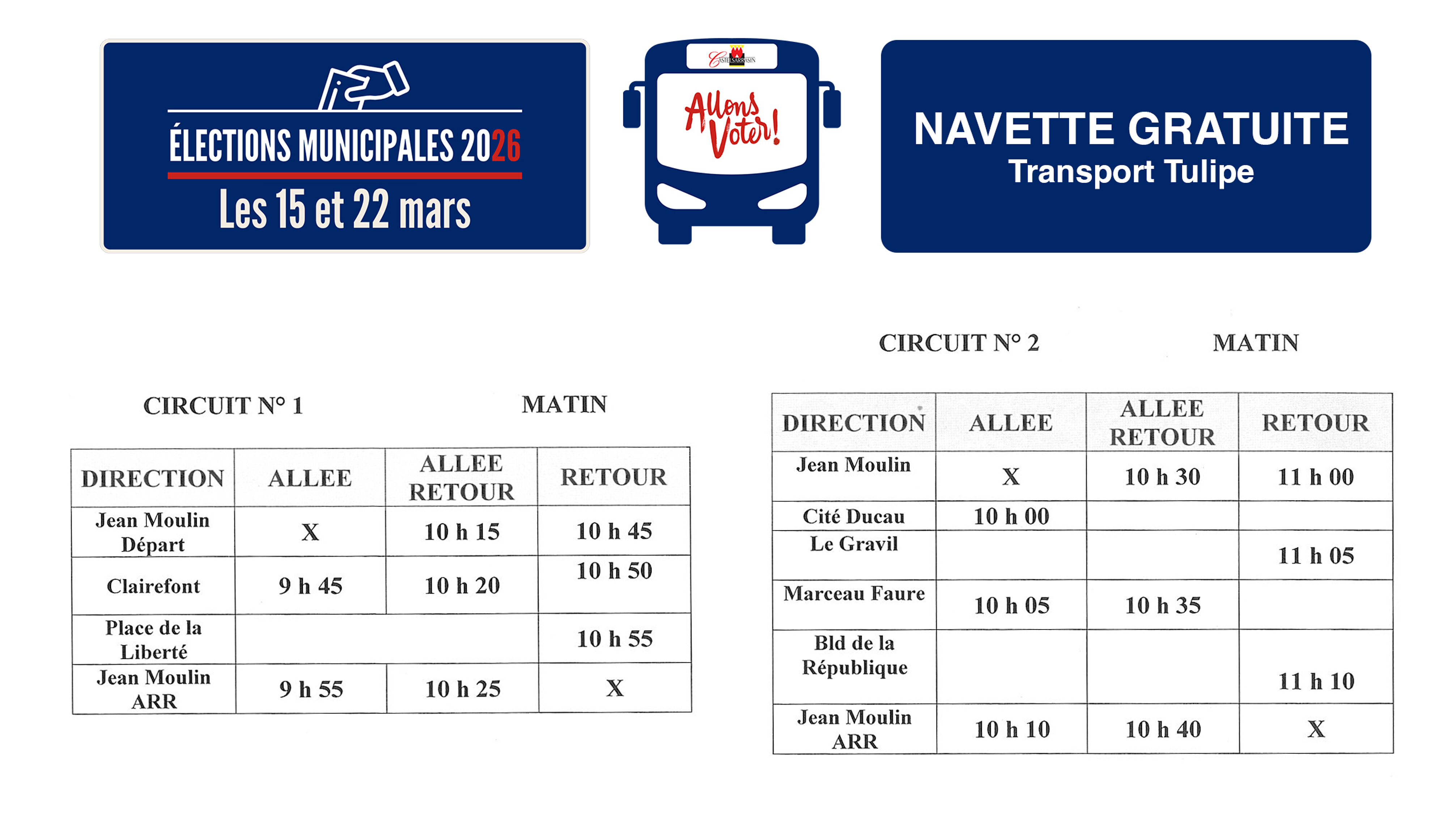 Afin d'en faciliter l'accès, la Municipalité met gratuitement à disposition le transport urbain Tulipe, le matin des dimanches 15 et 22 mars (horaires disponibles auprès de l'accueil et sur le site de la Ville).