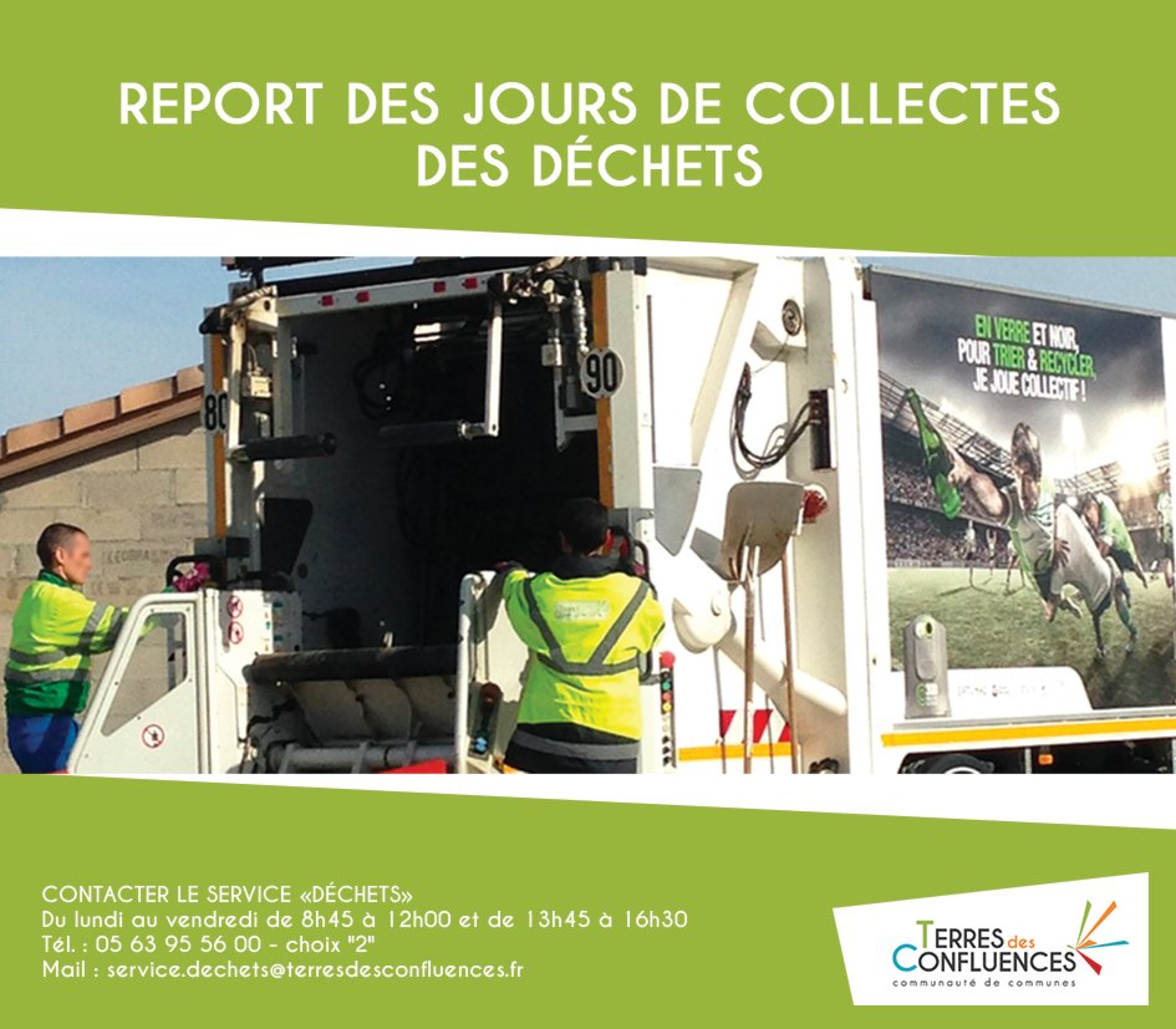 En raison des jours fériés du 25 décembre 2024 et du 1er janvier 2025, la Communauté de Communes Terres des Confluences informe les habitants que les collectes de déchets seront exceptionnellement décalées aux jours suivants, afin de garantir la continuité du service public dans les meilleures conditions.