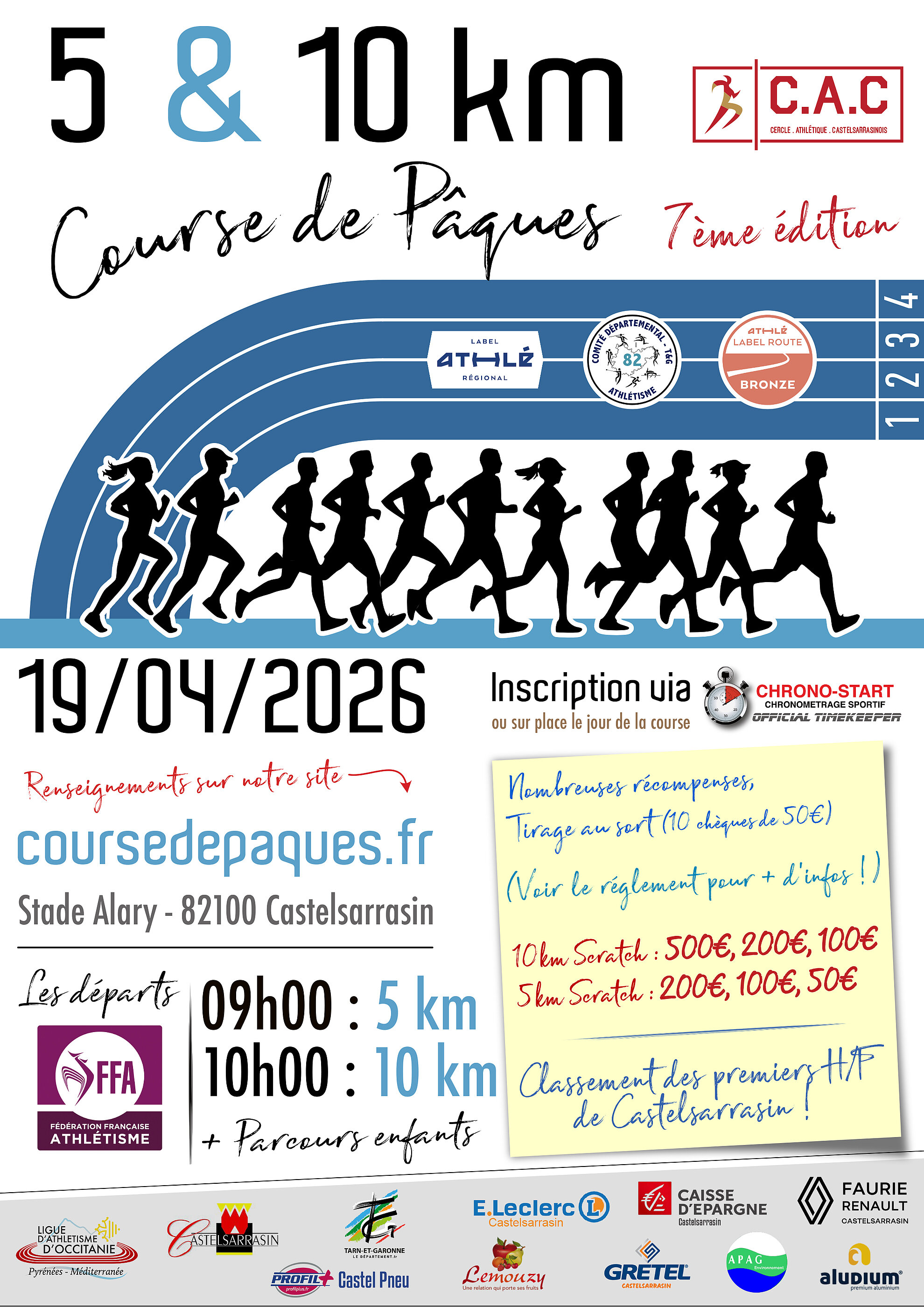 La Course de Pâques est un événement sportif annuel organisé par le CAC Athlétisme à Castelsarrasin pour sa 7e édition. L'arrivée des courses se fera sur la piste athlétique du stade Alary à Castelsarrasin.