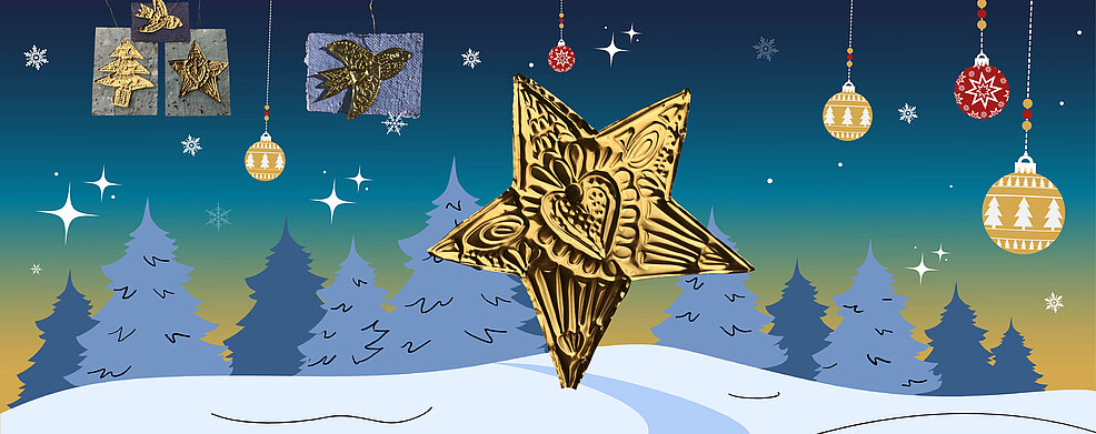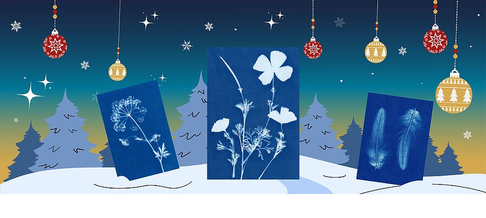 Réalisez vos cartes de voeux originales en cyanotype, avec des formes en impression 3D sur le thème de Noël et de la nouvelle année.