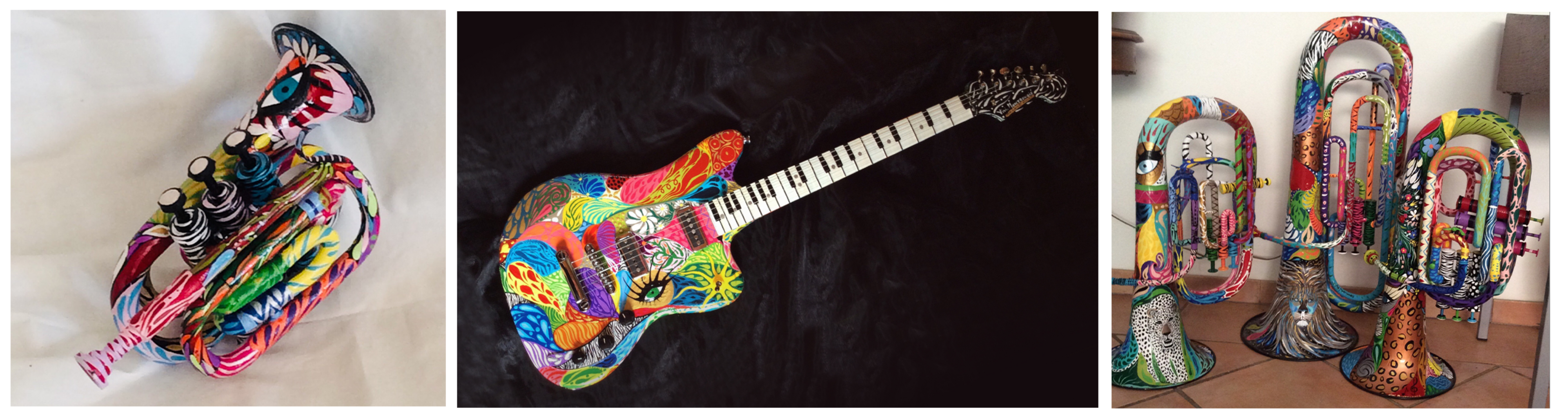 Artiste-peintre et sculptrice-plasticienne, Viviane Montrougié revisite les instruments de musique depuis mars 2020. Dès son premier instrument posté sur Facebook, les demandes affluent : ses créations voyagent aujourd’hui aux États-Unis, en Malaisie et dans plusieurs pays européens. Principalement destinés à la décoration, ces instruments peuvent également être joués sur demande.