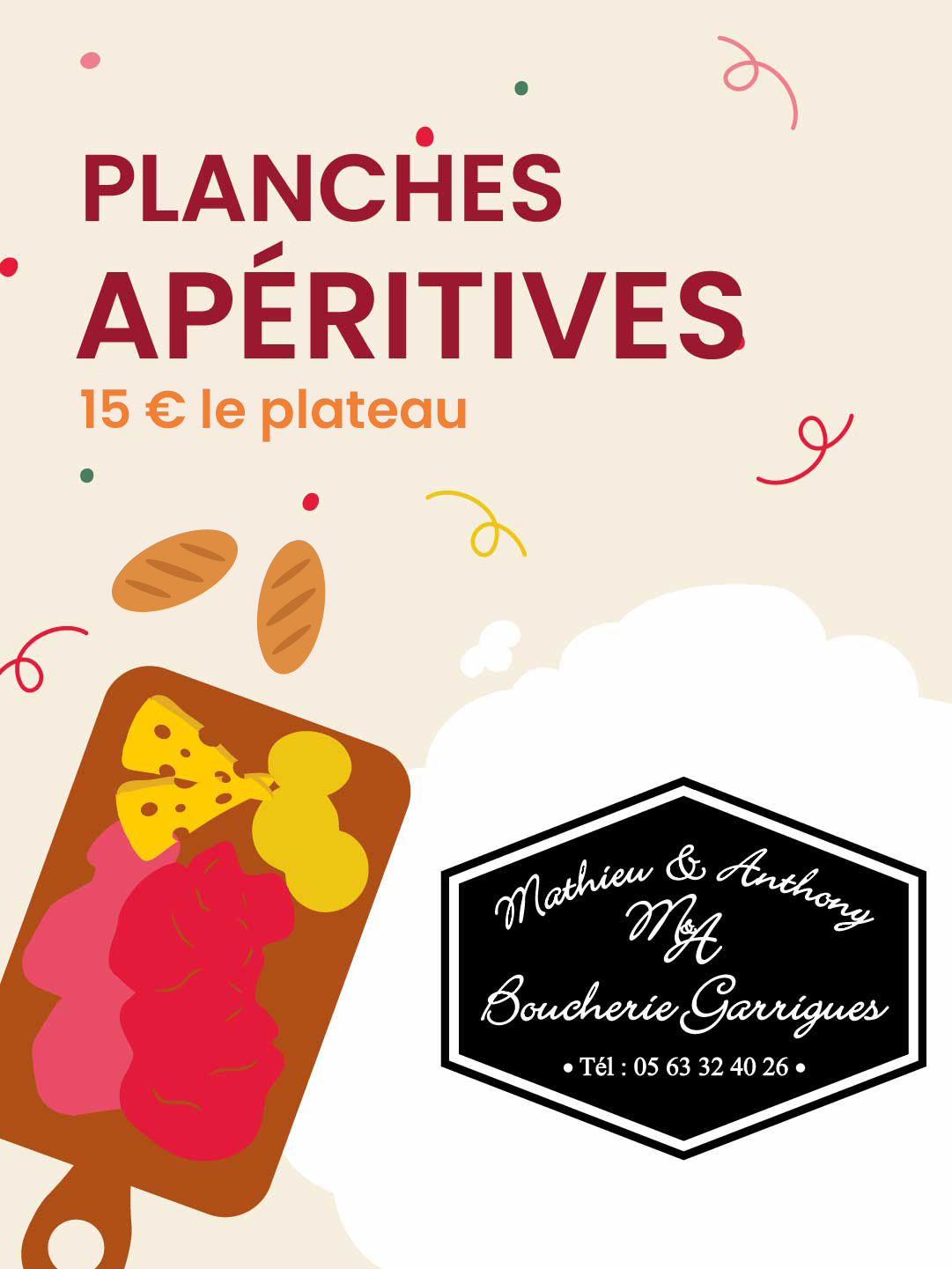 Planches apéritives à 15 € au choix (planche de fromage ou de charcuterie). Enseigne bien connue des Castelsarrasinois et reprise en 2019 par Anthony Duso et Mathieu Coureau (2 anciens apprentis devenus patrons), La Boucherie-Charcuterie Garrigues de l’Avenue Jean Brun amènera ses meilleurs produits et créations artisanales pour vous proposer des planches apéritives (charcuterie et fromage) pour accompagner votre after-work ou votre apéritif.