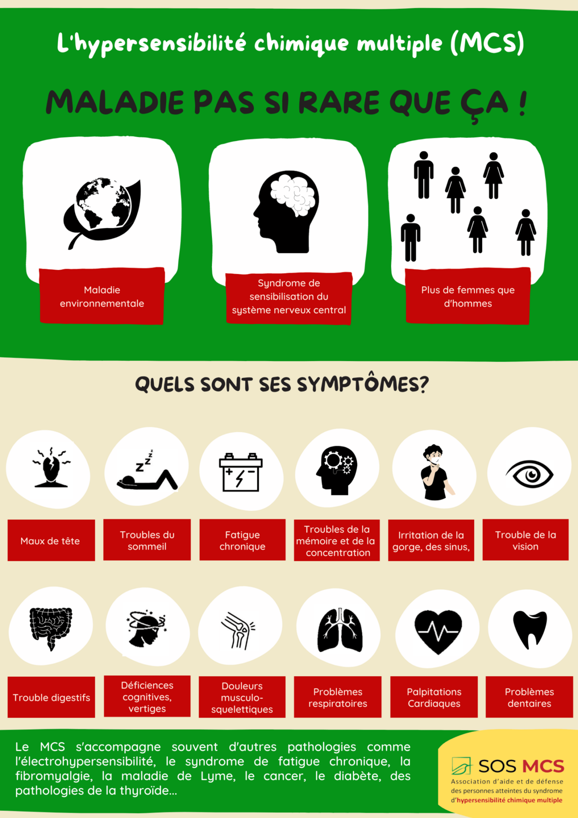 C'est une maladie chronique qui se caractérise par hypersensibilité à de nombreuses substances chimiques présentes dans l’environnement quotidien, telles que les parfums et produits parfumés, les cosmétiques, les produits d’entretien, les composés organiques volatils (peintures, solvants, plastiques, pesticides), les matériaux de construction et d’ameublement, ainsi que divers polluants atmosphériques (fumées, gaz d’échappement...).