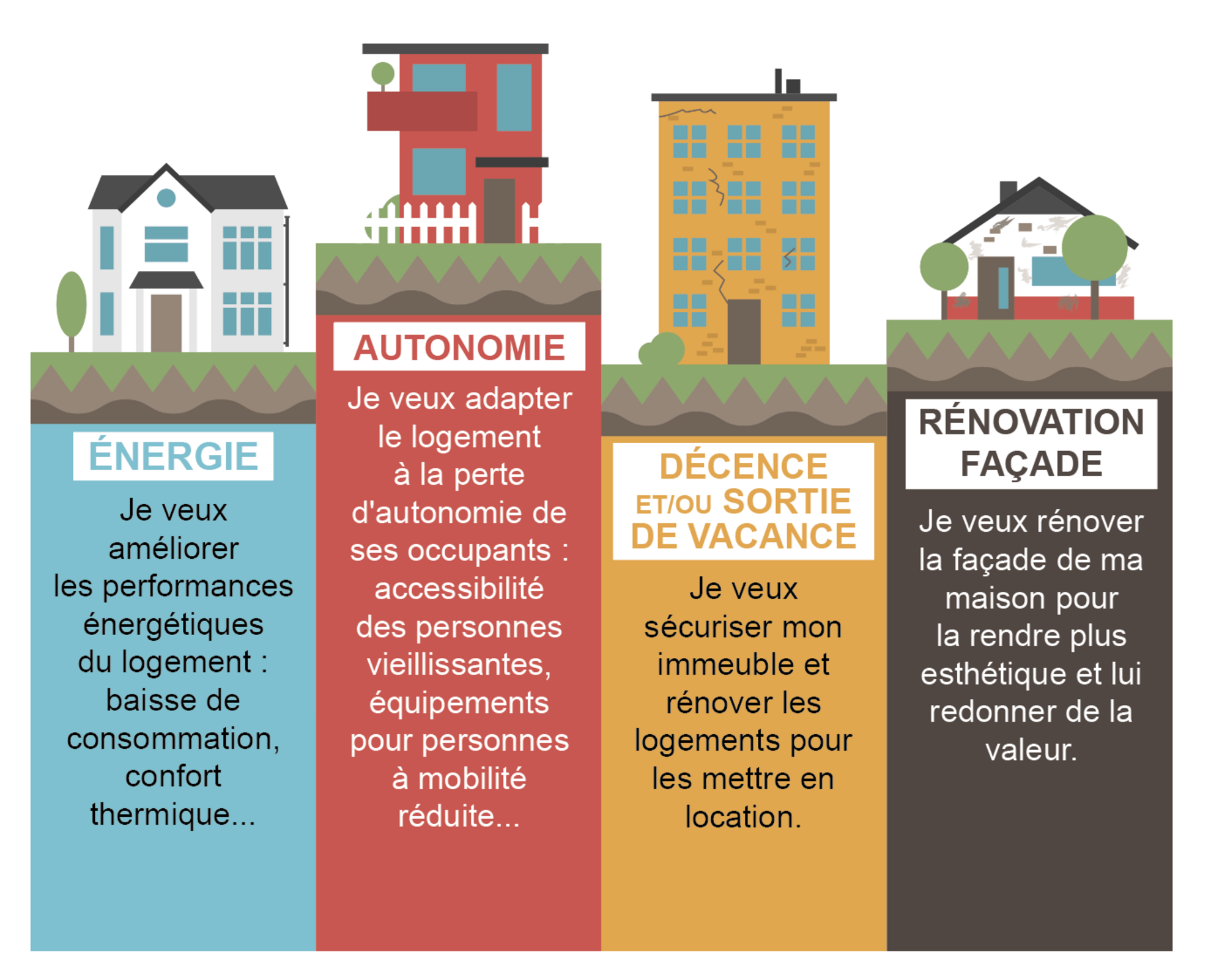 - améliorer l’état des logements, que ce soit en matière de confort (thermique notamment), de sécurité (par la résorption des désordres structurels) et de durabilité (réduction des charges pour les occupants),