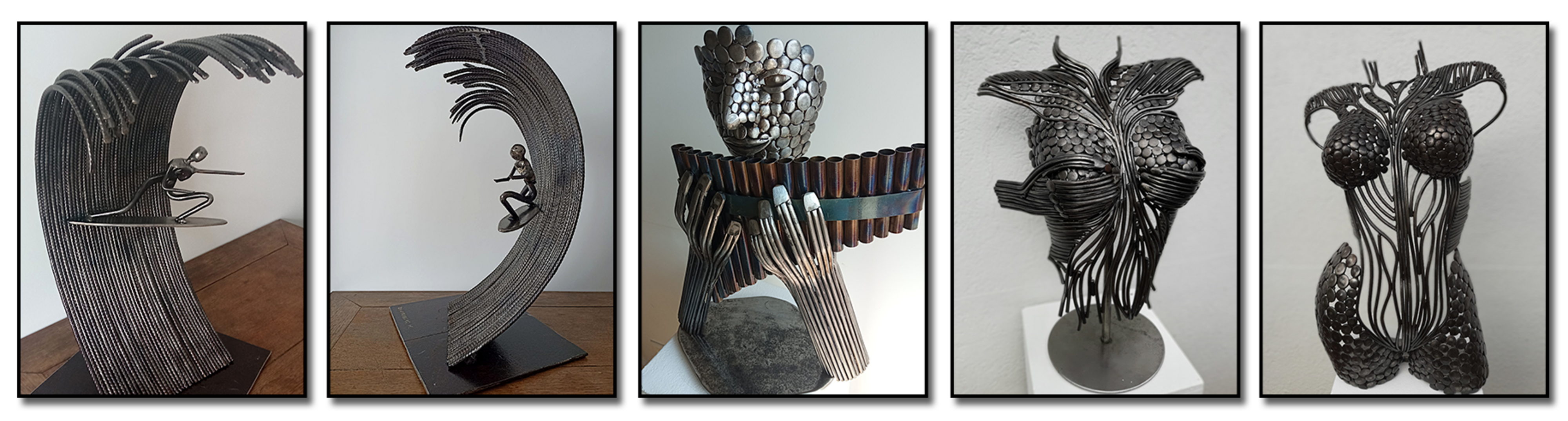 Métallier de formation, l’artiste travaille le fer de façon artisanale, à chaud ou à froid, par découpage, pliage, façonnage, soudage et ponçage. Le fer a toujours suscité en lui l’envie de créer des pièces décoratives et, après quelques années de pratique, il peut enfin s’épanouir et donner sa touche personnelle.