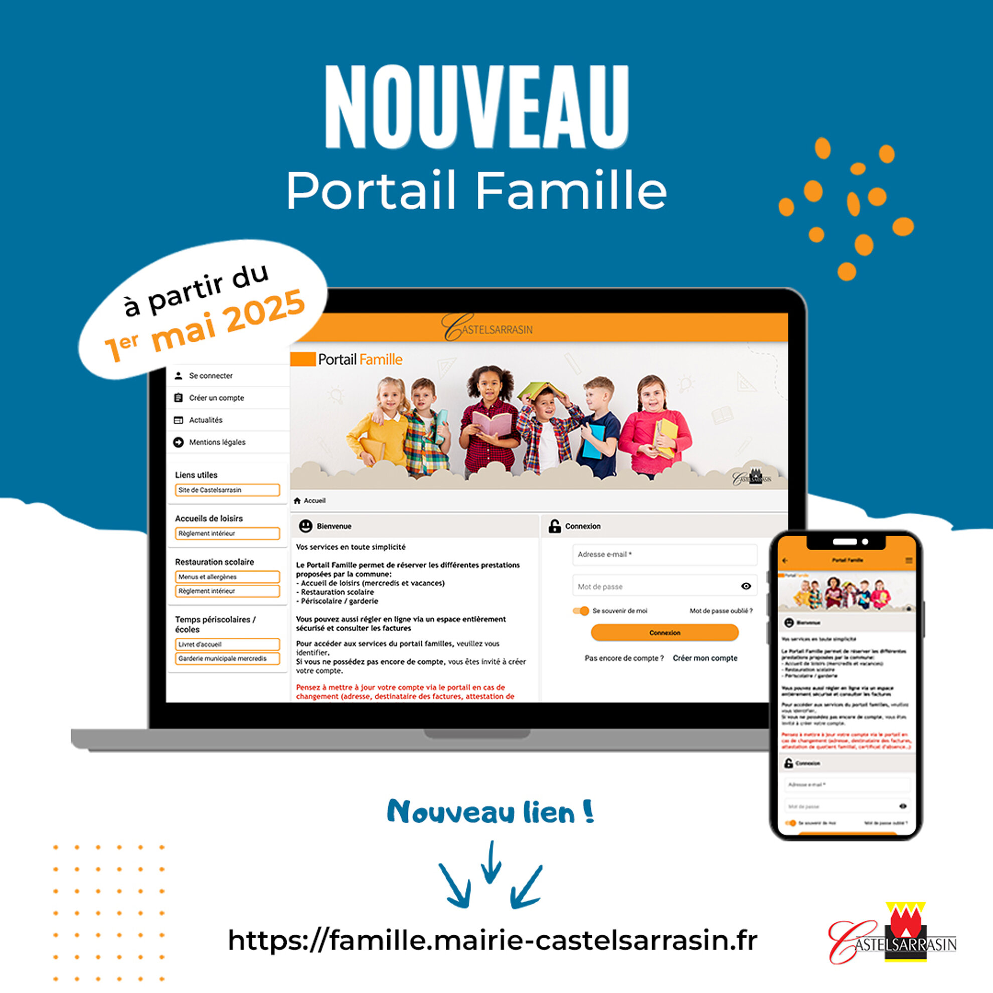 À compter du 1er mai, les réservations pour les prestations municipales ne se feront plus sur les portails CAP'école et CAP'CLSH. La Ville de Castelsarrasin met en place un nouveau Portail Famille développé par la société ABELIUM.