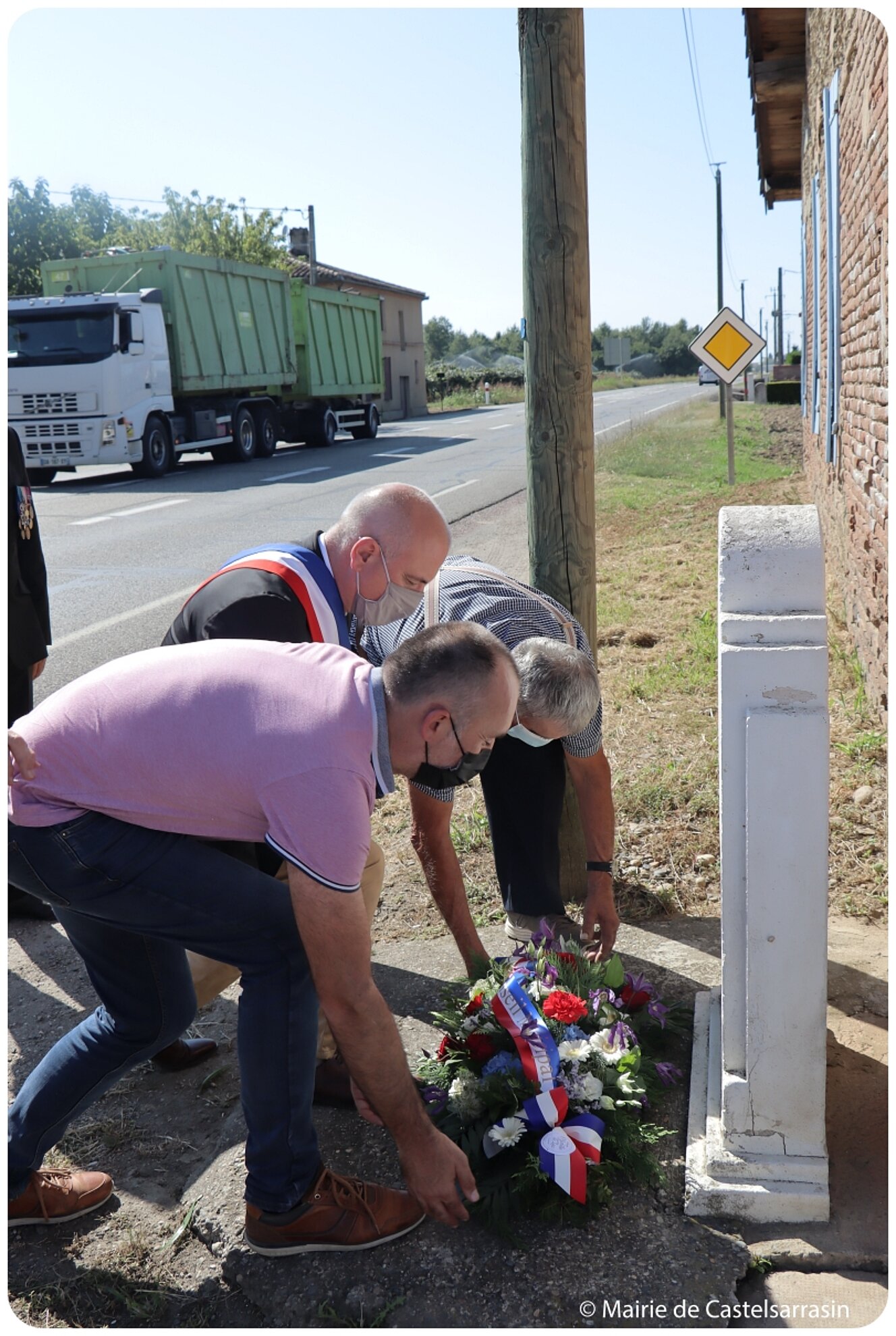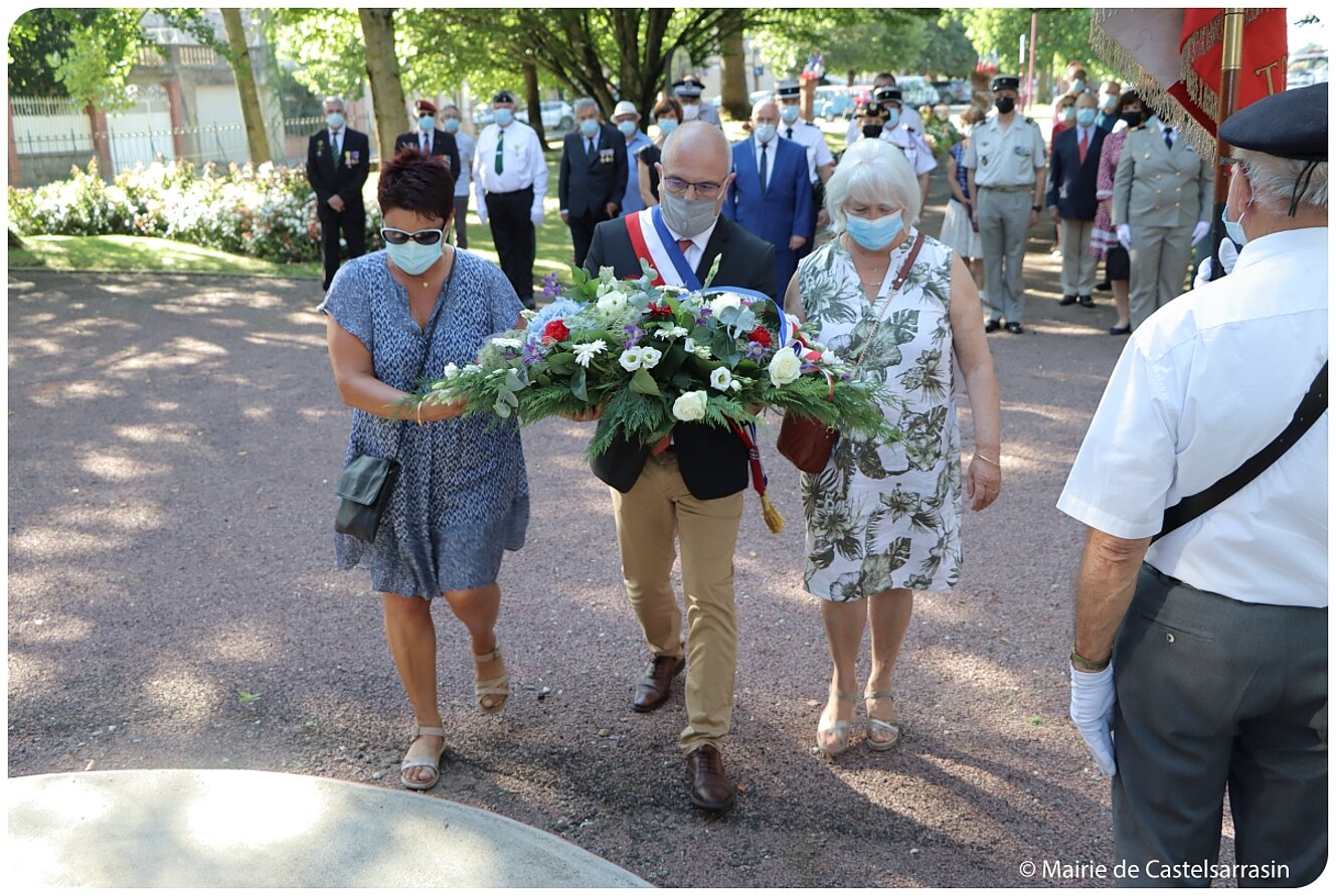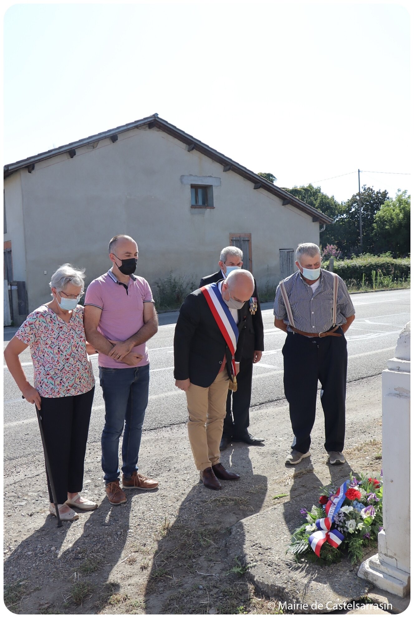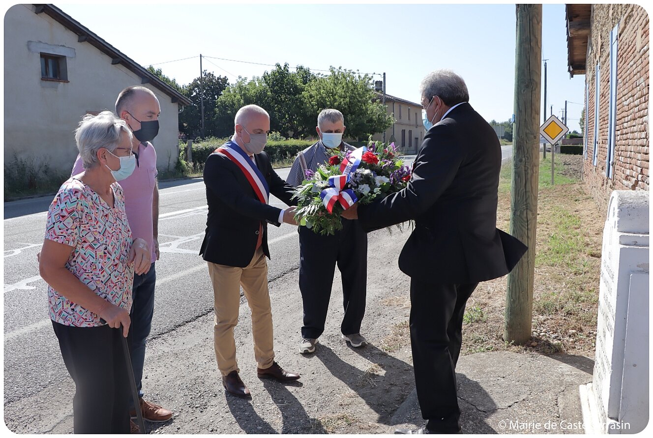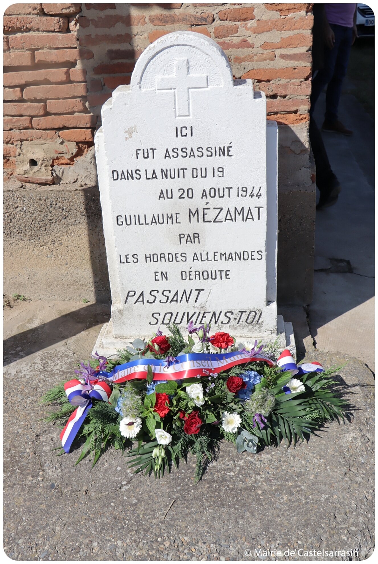 Les commémorations du 77ème anniversaire de la Libération de Castelsarrasin ont débuté par un hommage rendu à Guillaume MEZAMAT, qui perdit la vie dans la nuit du 19 au 20 août 1944. C’est en présence de son arrière petit fils Benoit et de son petit fils Léo accompagné de son épouse Marie-Thérèse, que Monsieur le Maire a déposé une gerbe sur la stèle érigée à sa mémoire. C'est ensuite au Monument aux Morts que la cérémonie officielle de la Fête de la Libération de la ville s'est déroulée.