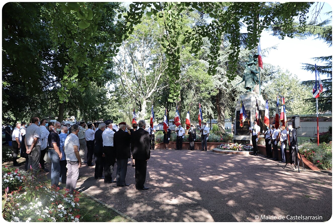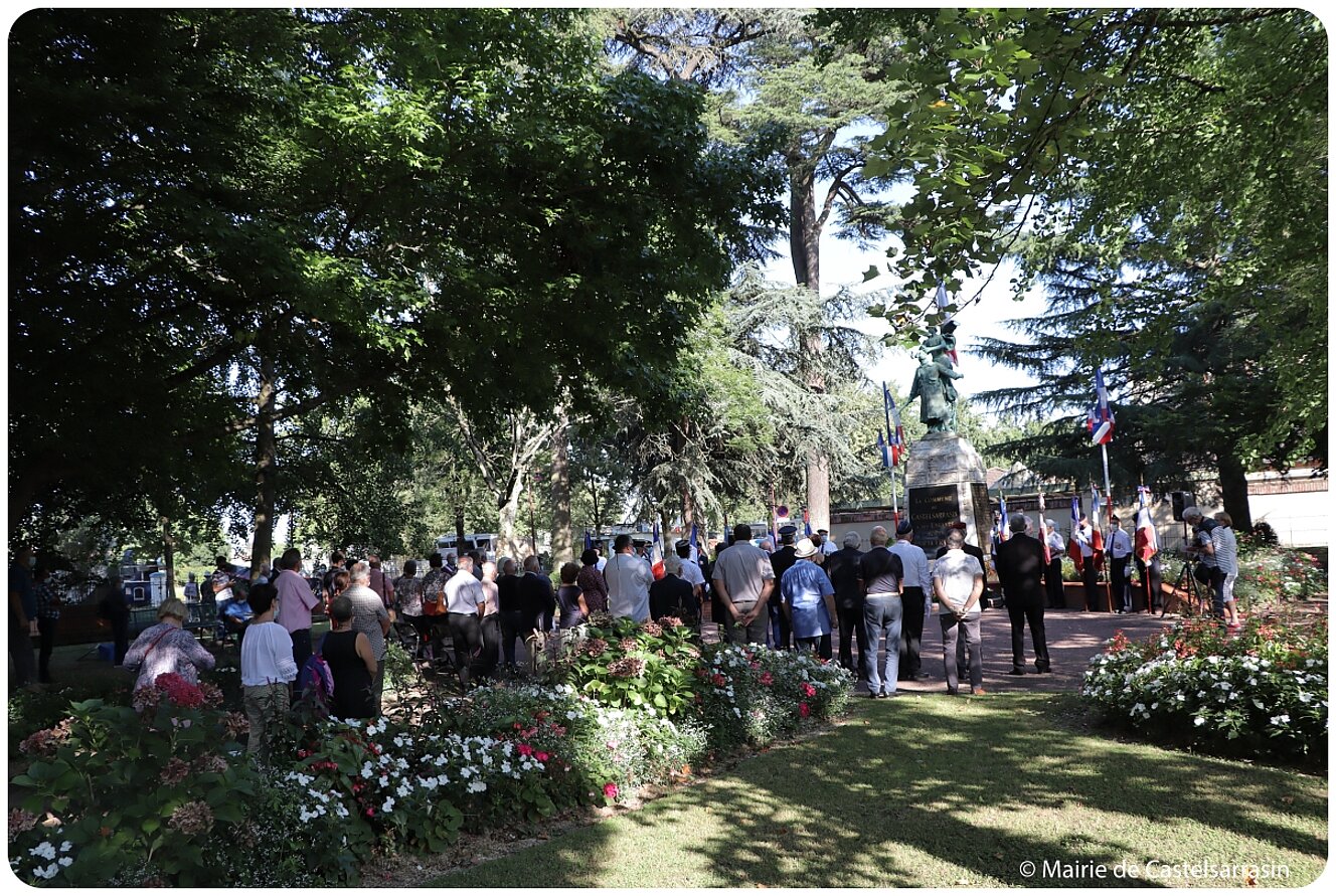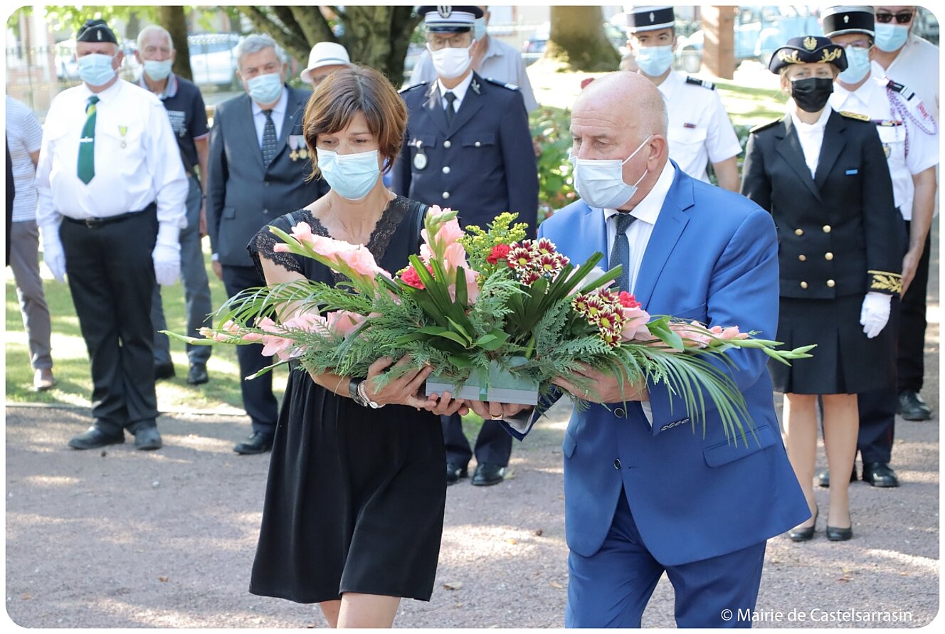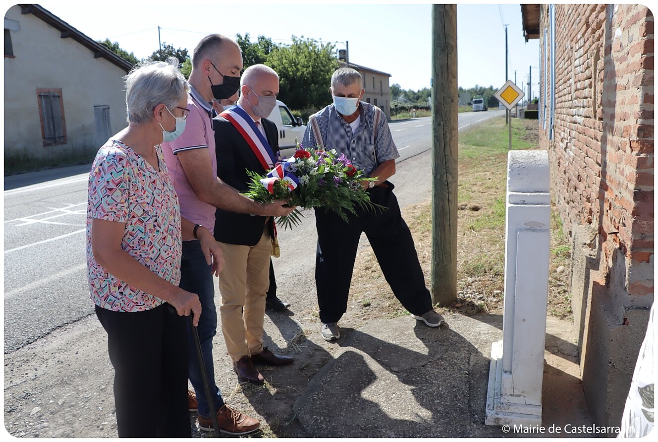 Les commémorations du 77ème anniversaire de la Libération de Castelsarrasin ont débuté par un hommage rendu à Guillaume MEZAMAT, qui perdit la vie dans la nuit du 19 au 20 août 1944. C’est en présence de son arrière petit fils Benoit et de son petit fils Léo accompagné de son épouse Marie-Thérèse, que Monsieur le Maire a déposé une gerbe sur la stèle érigée à sa mémoire. C'est ensuite au Monument aux Morts que la cérémonie officielle de la Fête de la Libération de la ville s'est déroulée.