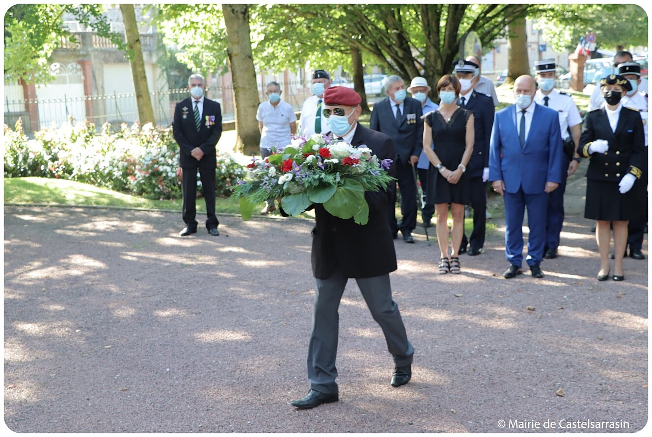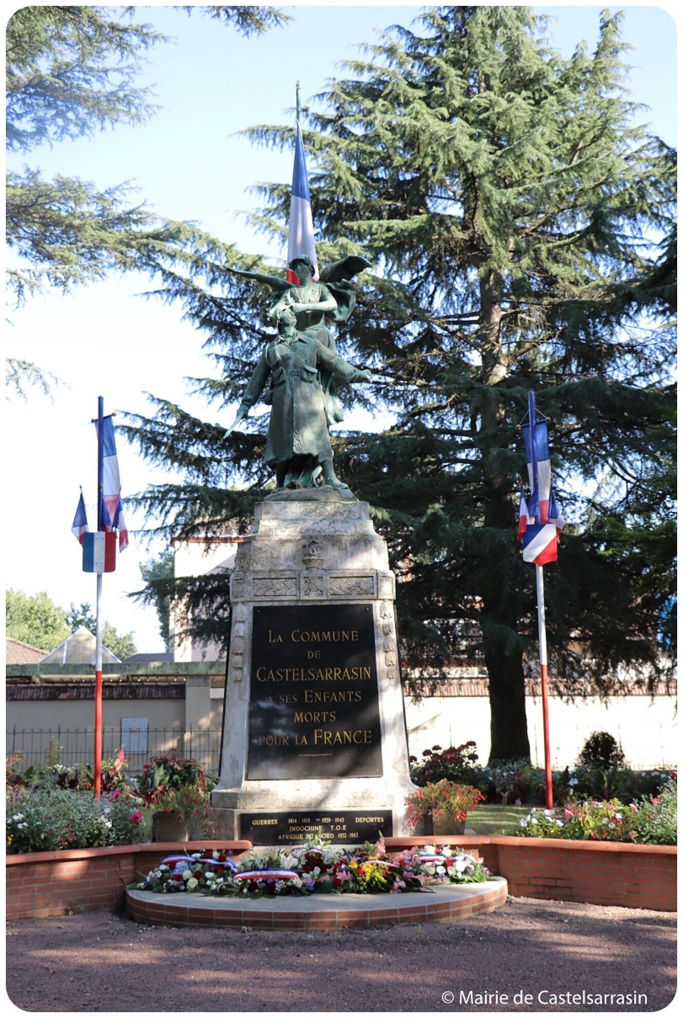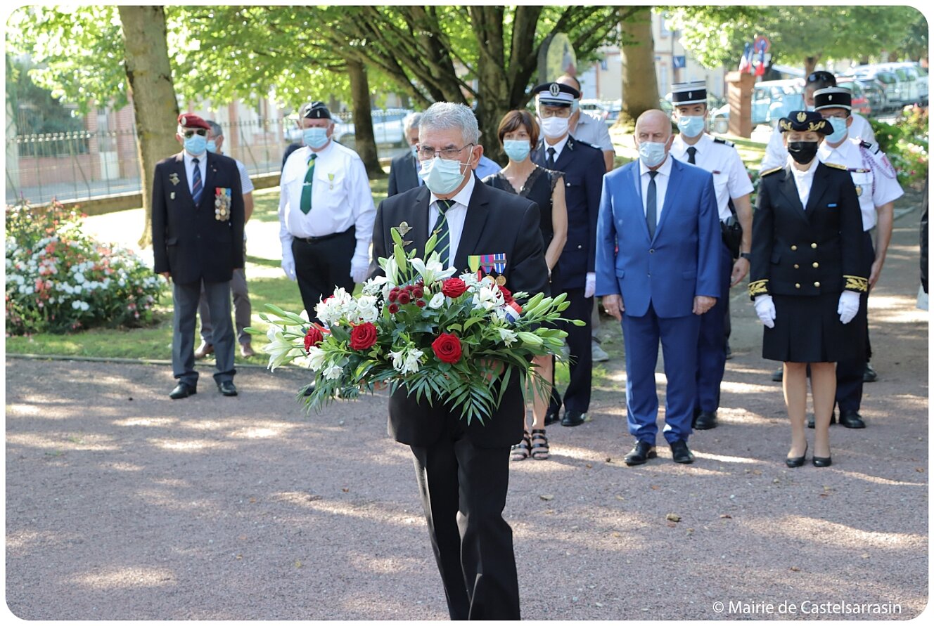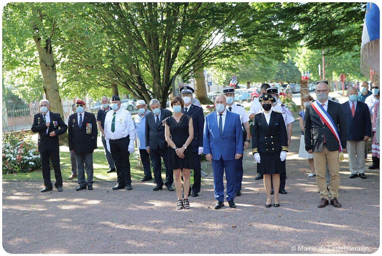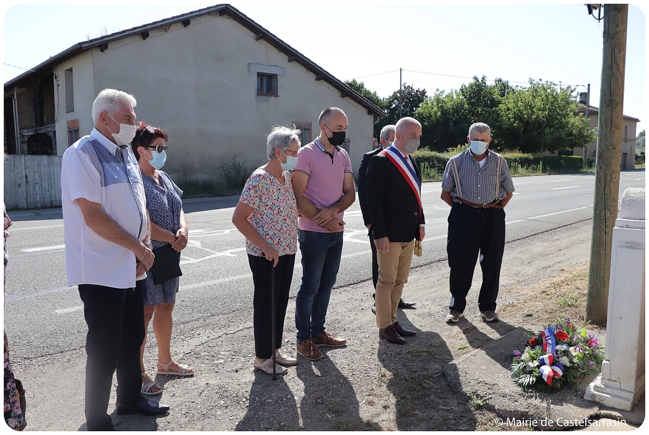 Les commémorations du 77ème anniversaire de la Libération de Castelsarrasin ont débuté par un hommage rendu à Guillaume MEZAMAT, qui perdit la vie dans la nuit du 19 au 20 août 1944. C’est en présence de son arrière petit fils Benoit et de son petit fils Léo accompagné de son épouse Marie-Thérèse, que Monsieur le Maire a déposé une gerbe sur la stèle érigée à sa mémoire. C'est ensuite au Monument aux Morts que la cérémonie officielle de la Fête de la Libération de la ville s'est déroulée.