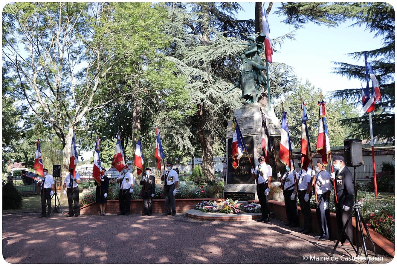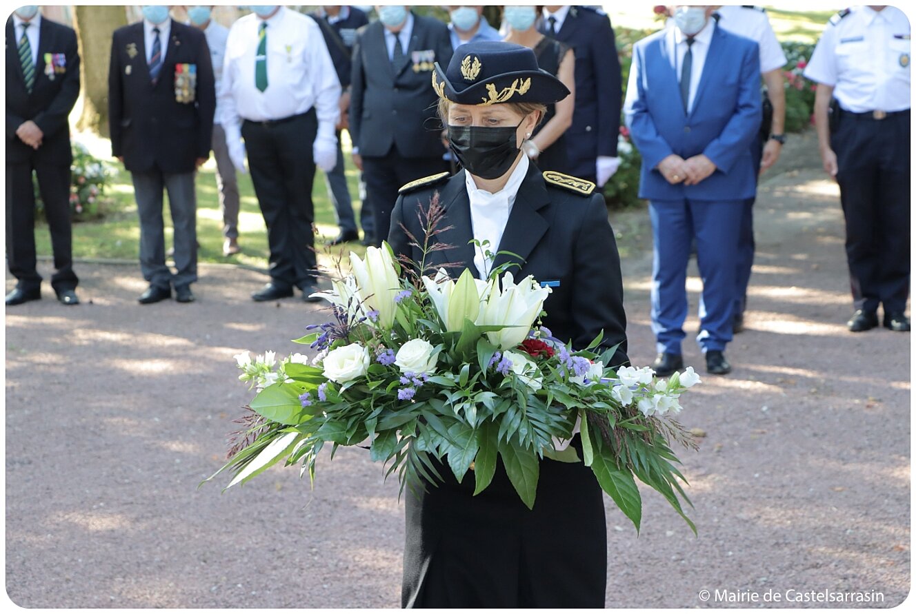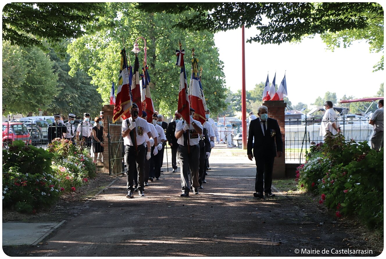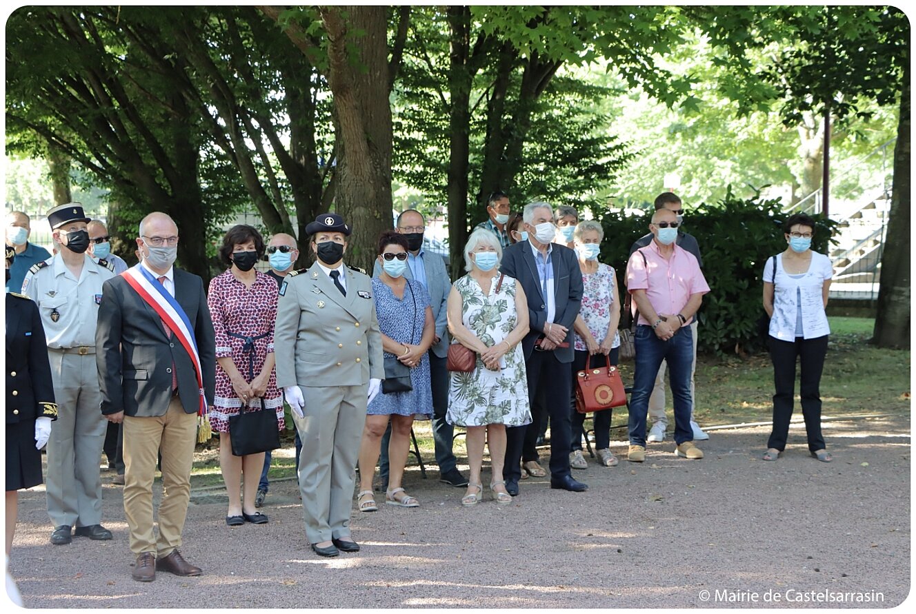 Les commémorations du 77ème anniversaire de la Libération de Castelsarrasin ont débuté par un hommage rendu à Guillaume MEZAMAT, qui perdit la vie dans la nuit du 19 au 20 août 1944. C’est en présence de son arrière petit fils Benoit et de son petit fils Léo accompagné de son épouse Marie-Thérèse, que Monsieur le Maire a déposé une gerbe sur la stèle érigée à sa mémoire. C'est ensuite au Monument aux Morts que la cérémonie officielle de la Fête de la Libération de la ville s'est déroulée.