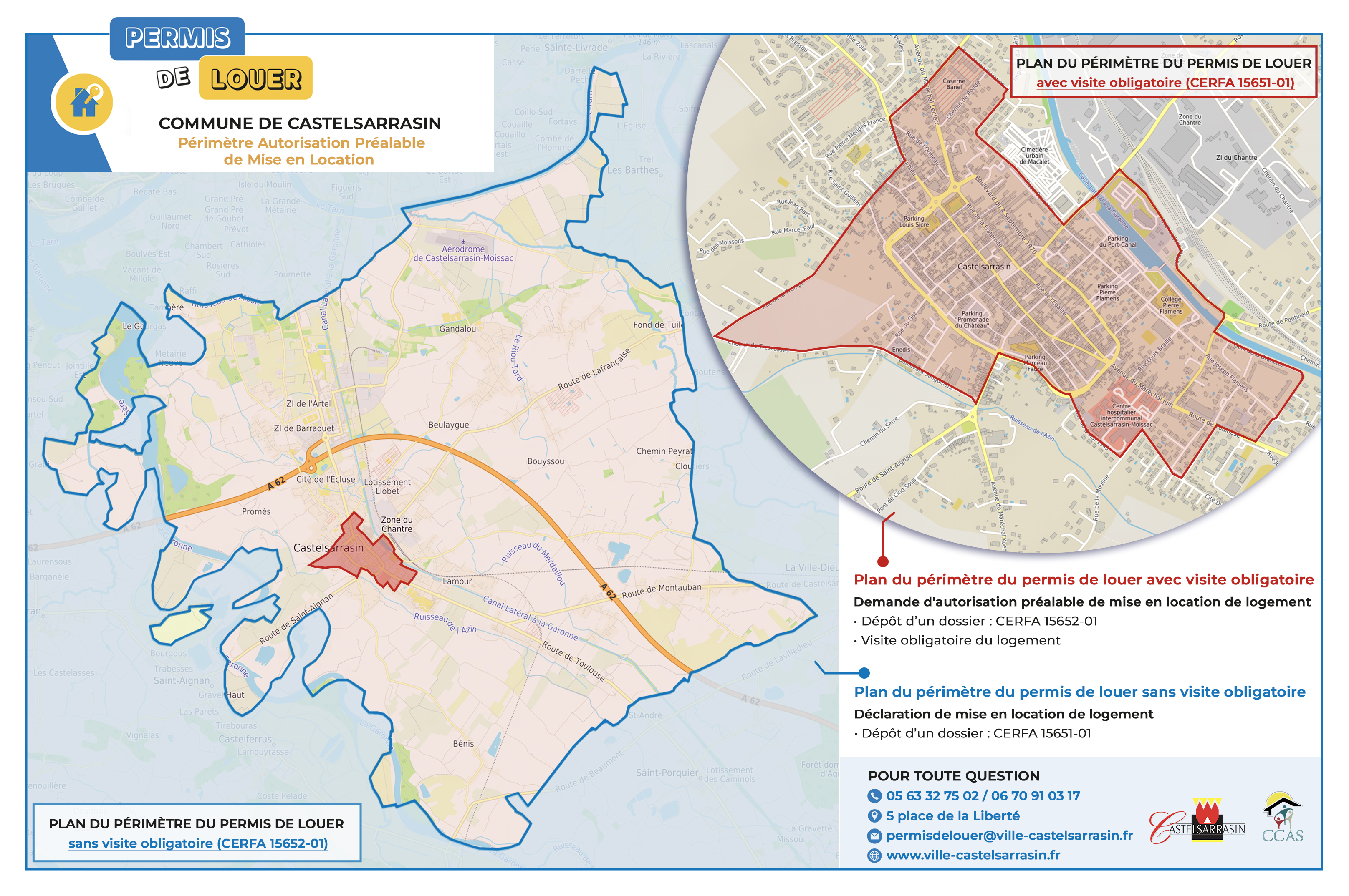 - par voie postale en courrier recommandé avec accusé de réception à : CCAS - Service Logement / Permis de louer - 5, place de la Liberté - BP 50 020 - 82 100 CASTELSARRASIN