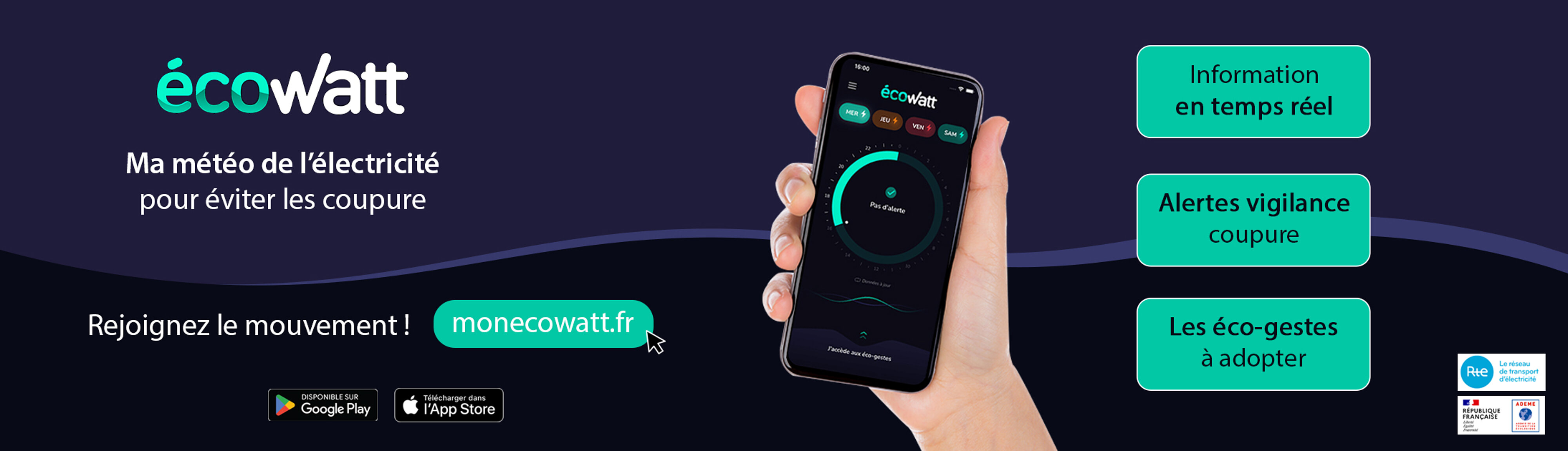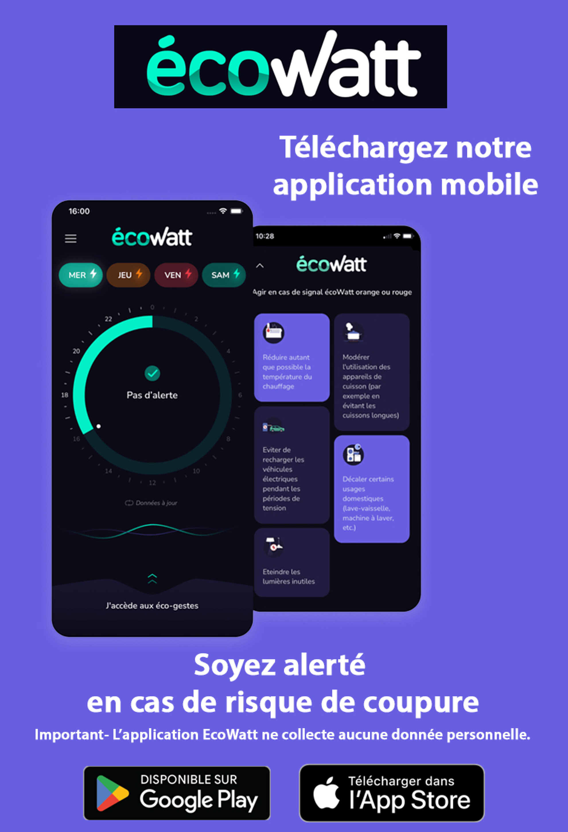 Il est recommandé de télécharger l’application Ecowatt (App store et Google Play) et d'activer les notifications pour être averti d’un risque de coupure.