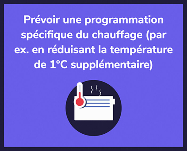 - Veiller au respect de la température du logement à 19 degrés et baisser la température du logement à 16 ou 17 degrés en cas d’absence en journée ou la nuit.